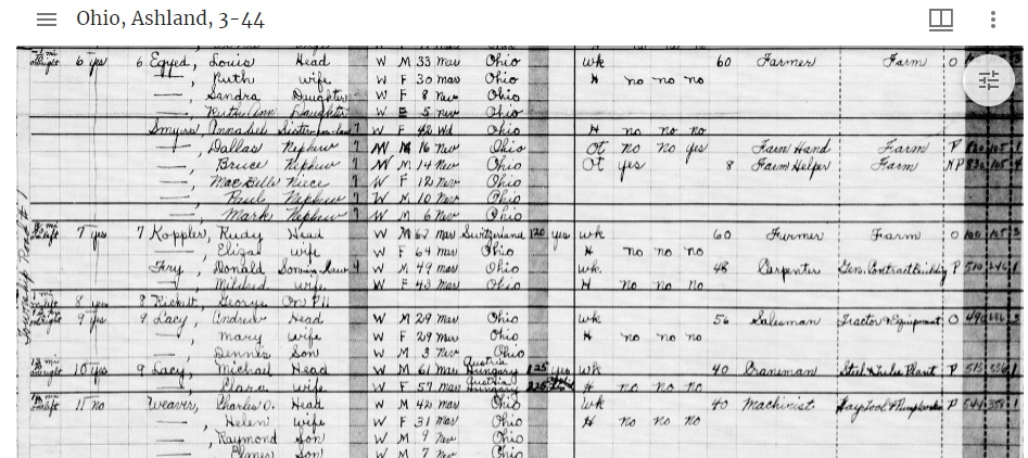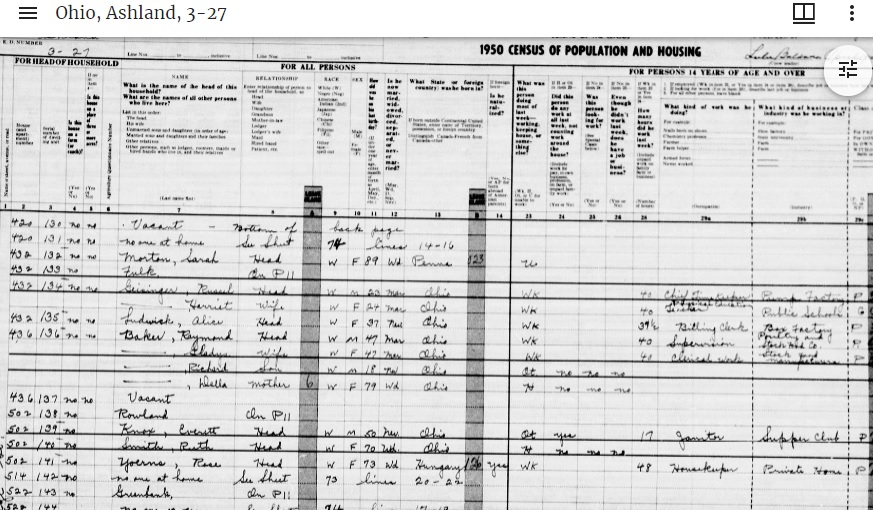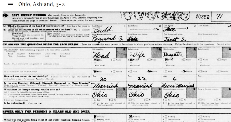 The 1950 Census was released on April 1, 2022 under the “72-year Rule”. It can be searched here: The good news is that it's fast, being loaded on a cloud server. However, an attempt was made to use machine-readable text -- AND IT'S TERRIBLE. As an example, there are Fry family members all over Ashland County, OH and it can't find any of them. When you do find a family member, it's highly recommended that you use the transcription feature to correct and add names to the name index. The Census website says that transcription corrections will appear in about 24 hours, but I've done them for numerous family members and the changes haven't appeared yet after three days. While private services like Ancestry.com will eventually index all of the people, initially you’ll have to find the right Enumeration District (ED) in each state. There were 180,000 of these districts but you can find the right ED ahead of time at this website: stevemorse.org The ED search is made easier if you’re aware of what cross streets are at either end of your address.