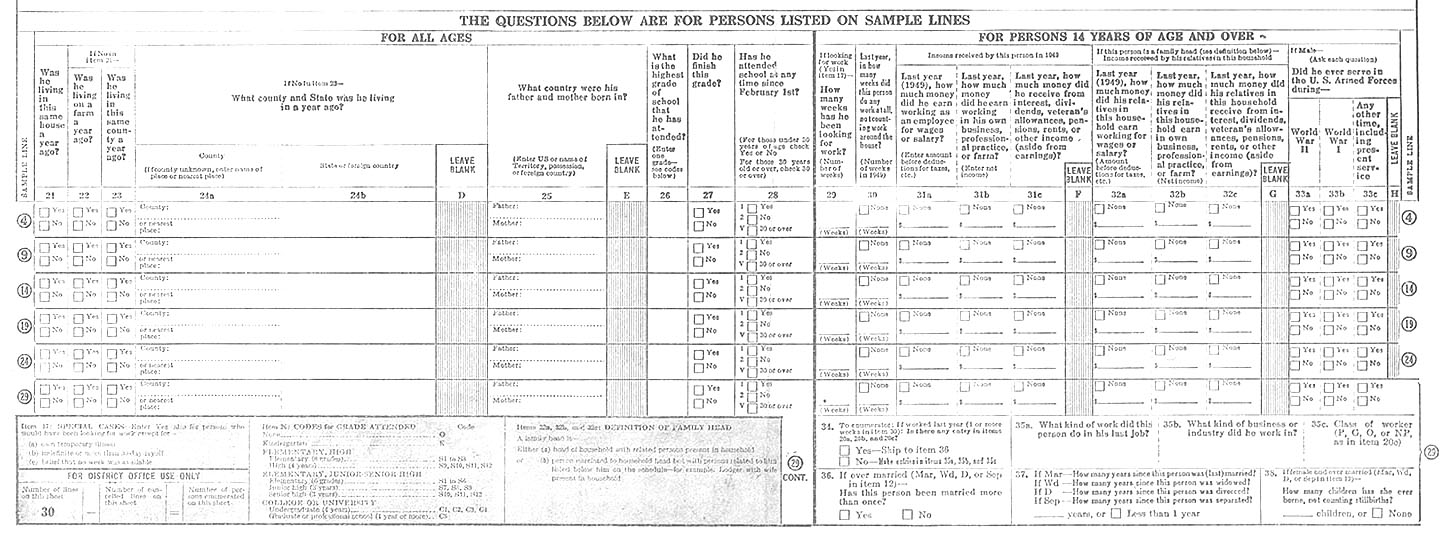 Click here for a larger version of the Census survey As samples, for six of the 30 lines on each Census page, additional information was collected on education, income, previous place of residence, military service and (for women) the number of children borne. This was entered at the bottom of the enumeration page.